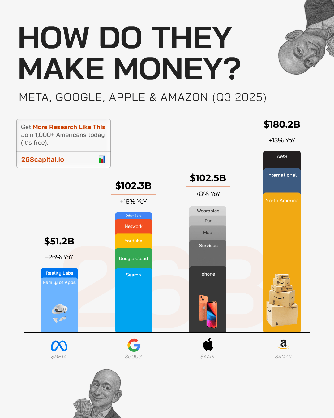 Four giants. Four cash-printing machines. Here’s how Meta, Google, Apple, and Amazon performed in Q3 2025 — and what it says about Big Tech’s momentum.