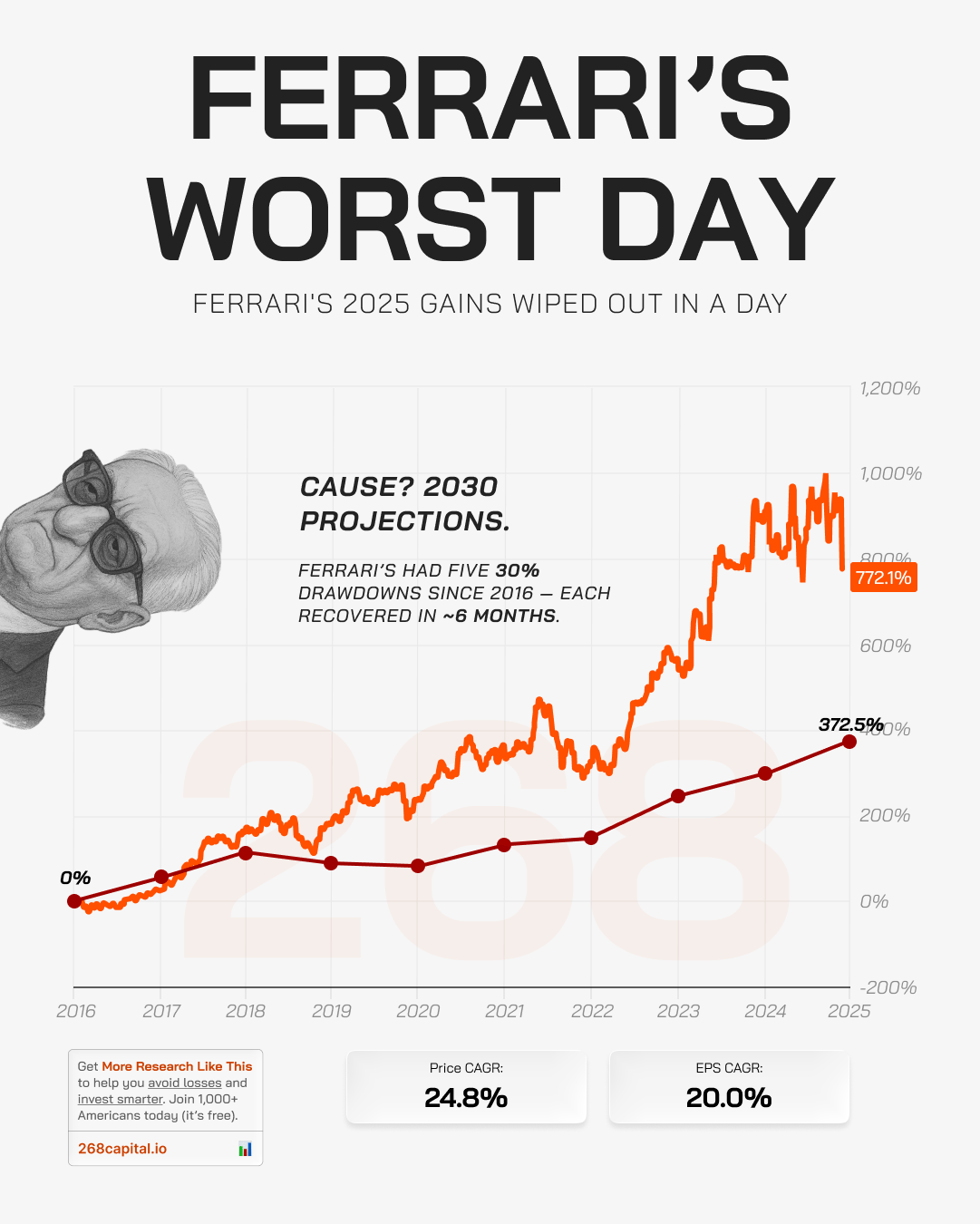 Ferrari’s 2025 gains were wiped out in a single trading day. But history shows every 30% drop since 2016 has recovered in around six months.