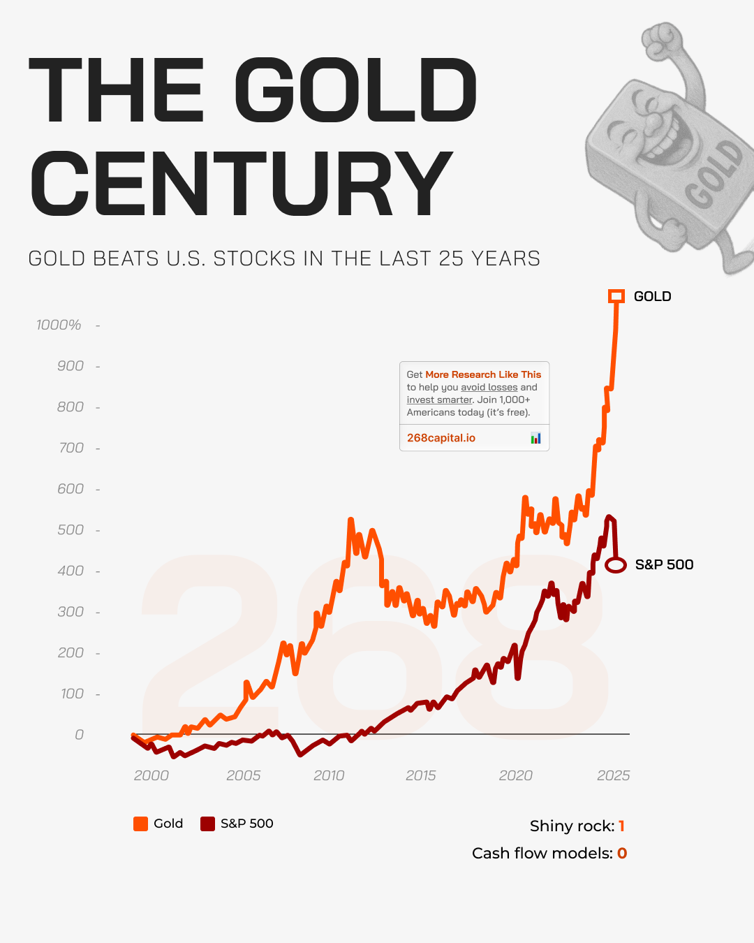 Gold’s long-term performance tells a story few expected. Since 2000, the metal has surged more than 900%, outpacing even the S&P 500’s strong total return.