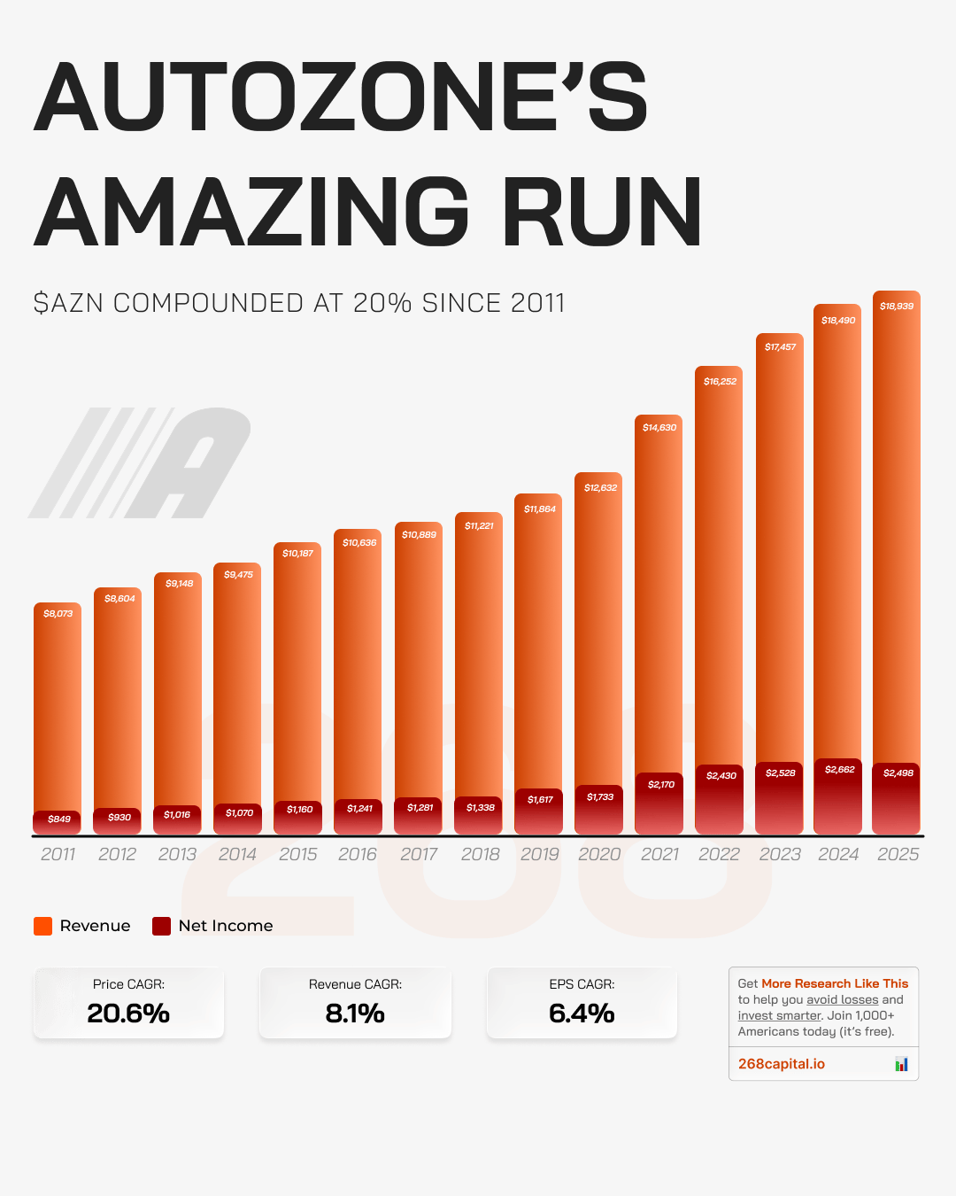 AutoZone has compounded at roughly 20% annually since 2011—outpacing most tech darlings by simply selling car parts and buying back its own stock.