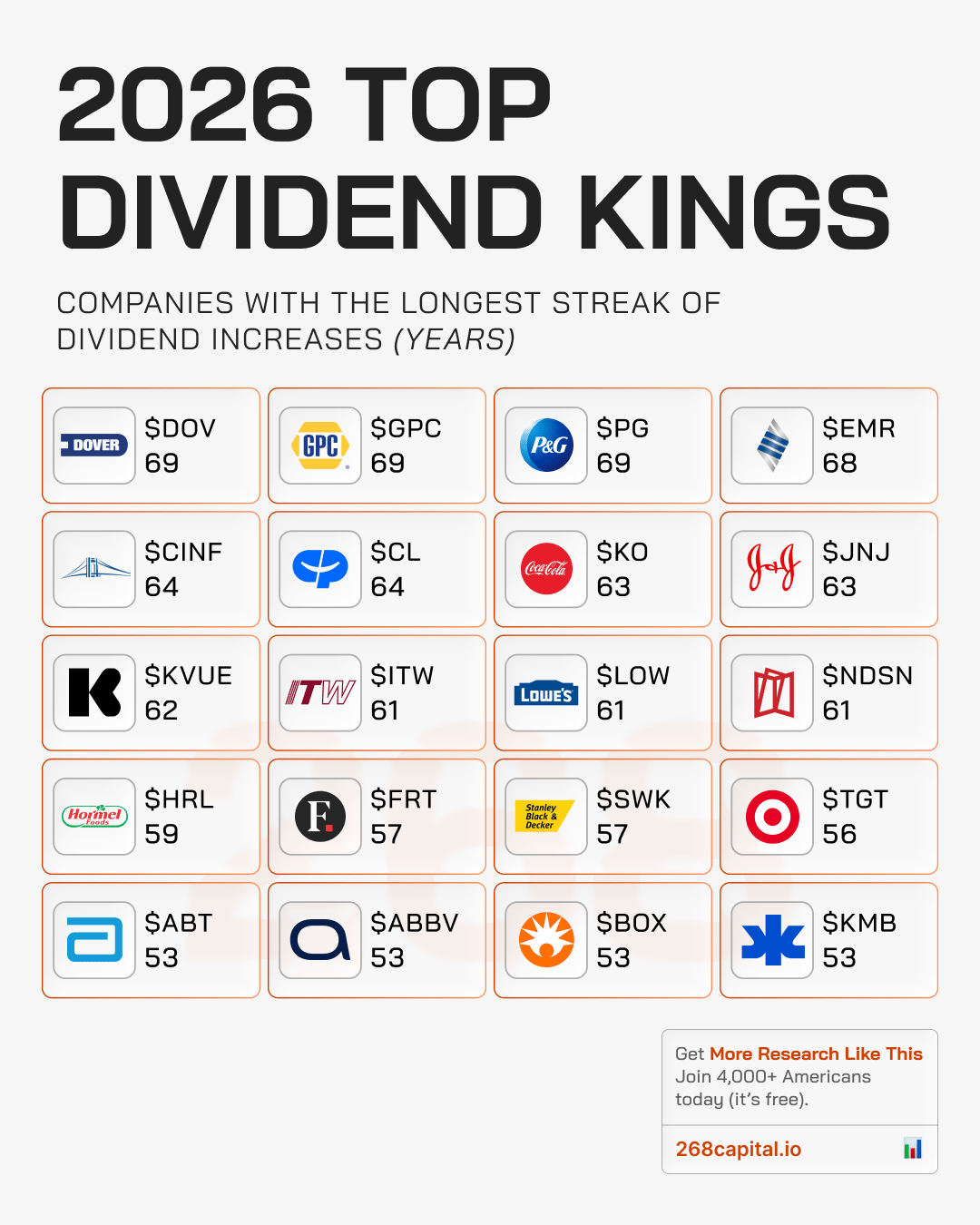Companies that increased dividends for 50+ consecutive years.