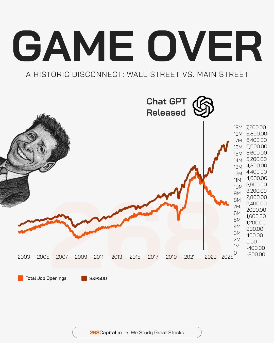 Total U.S. job openings have dropped sharply since 2022, while the S&P 500 has soared. The release of ChatGPT in late 2022 may have accelerated a major shift—AI-driven productivity is rising, but human demand is falling.