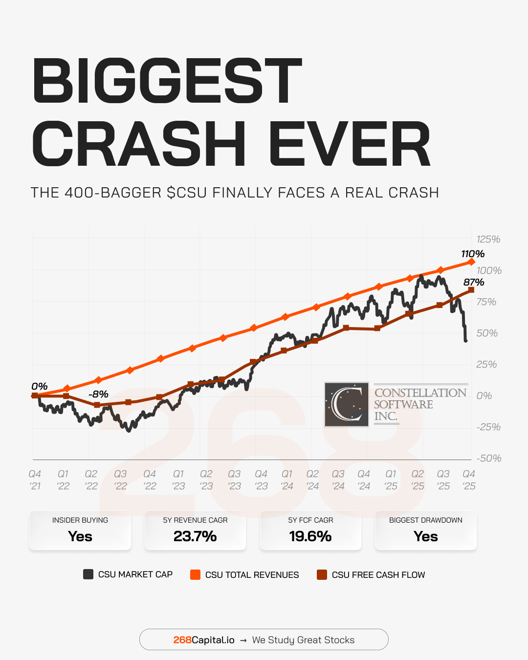 Constellation Software ($CSU) — a 400-bagger over two decades — is now facing its biggest drawdown in history. But the fundamentals paint a different picture.