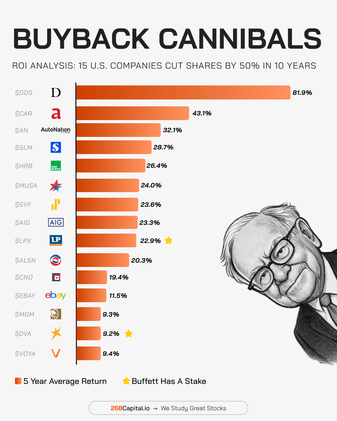 The group’s average 5-year CAGR of 25.7% shows how capital discipline can compound over time. Leading the pack is Dillard’s ($DDS), a regional department store chain that’s been using steady profits to buy back stock and streamline operations.